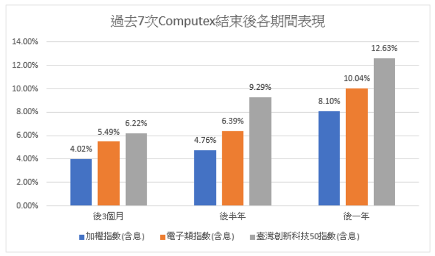 COMPUTEX之後創新科技標的通常有不俗表現,以投資創新科技標的為主的臺灣創新科技50指數為例,過去7次(排除2020年因疫情停辦)COMPUTEX結束後3個月、6個月及1年,該指數平均上漲6.22%、9.29%、12.63%,勝過大盤的4.02%、4.76%、8.10%,以及電子類指數的5.49%、6.39%、10.04%。