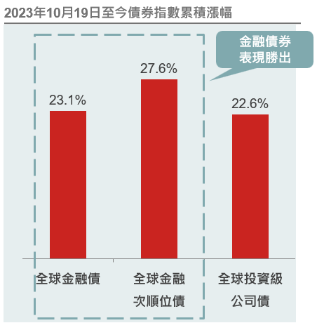 金融債近期表現出色,主要受惠於美降息循環展開、財報亮眼以及監管放寬等利多加持。根據統計,自2023年10月19日全球金融債殖利率走低以來,全球金融債指數與全球金融次順位債指數分別上漲23%與27%(請參考第二頁圖表),表現優於全球投資級公司債,目前金融債與金融次順位債到期殖利率分別為4.15%與4.53%,仍處於長期的相對高檔,且美債殖利率未來有望進一步走低,金融債持續看好。
