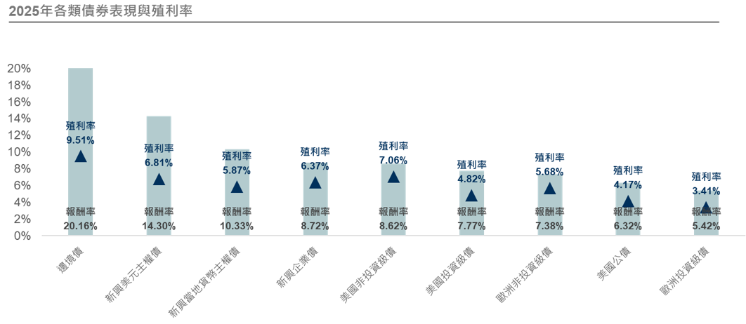 資料來源:Bloomberg,2025/12/31。以上採避險至美元後報酬率。以上採摩根大通邊境市場債/新興美元主權債/新興當地貨幣主權債/新興美元企業債指數、彭博歐洲投資等級債/歐洲非投資等級債/美國投資等級債/美國非投資等級債/美國公債指數, 投資人無法直接投資指數,本資料僅為市場歷史數值統計概況說明,非基金績效表現之預測。本文提及之經濟走勢預測不必然代表基金之績效,基金投資風險請詳閱基金公開說明書。