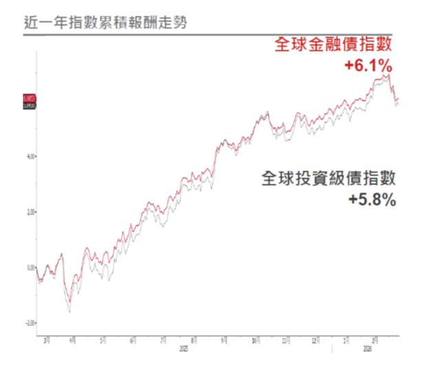 其次,信用市場的利差持續擴大。油價大漲對消費支出形成壓力,企業融資成本上升,尤其是能源密集型與循環性產業的再融資風險加劇。相對而言,金融業受益於eSLR改革與壓力測試資本緩衝凍結,資本充足度提升,債務供給下降,有利於金融債的表現;須留意短期亦受到私募信貸過度集中軟體業及流動性擔憂,波動加大。整體而言,長天期金融債、混合資本債與次順位金融債仍是逢低配置的首選。
