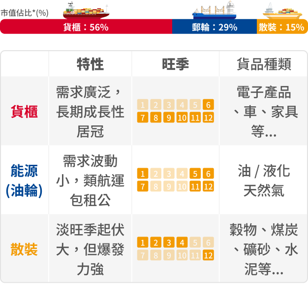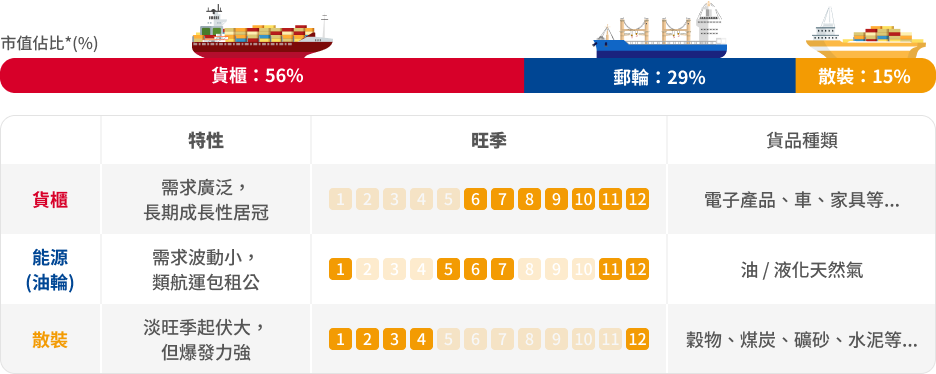 資料來源: World Ocean Review、UNCTAD、Mordor Intel、野村投信整理,2024/6。*市值佔比係採NYSE FactSet 全球航運龍頭息收指數之次產業分布作為說明代表,2024/5/31。投資人申購本基金係持有基金受益憑證,而非本文提及之投資資產或標的。