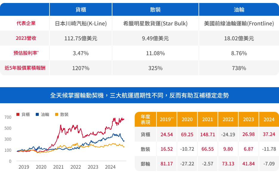 上圖資料來源:Bloomberg、野村投信整理; *參考彭博毛股利率。資料日期:2019/5/31-2024/12/31。成分股可能因指數成分調整而變動。以上僅作舉例說明說明,非為個股推薦。投資人申購本基金係持有基金受益憑證,而非本文提及之投資資產或標的。下圖(表)資料來源:ICE Data、Bloomberg,指數採NYSE FactSet 全球航運龍頭息收指數回測期間為2019/2/28-2024/5/31。**2019/2/8-2019/12/31。計算方式,總報酬計算方式: (最後一天數值/第一天數值)-1。(NYSE FactSet 全球航運龍頭息收指數最早收盤日期:2019/2/8,指數發布日為2024/4/22)。以上僅為ETF追蹤指數績效或殖利率之表現,不代表本ETF基金之實際報酬率或配息率及未來績效保證,不同時間進場投資,其結果將可能不同,且並未考量交易成本。本基金主要係採用完全複製法追蹤標的指數之績效表現為目標,然因基金必要費用、為因應申贖及指數調整等之相關交易、為維持曝險比例而從事證券相關商品交易及視特殊情形需要採最佳化複製法等因素,仍可能使本基金偏離標的指數之表現。以上僅為標的指數成分股歷史資料回測結果,不代表本基金之未來績效保證。投資人無法直接投資指數,本資料僅為市場歷史數值統計概況說明,非基金績效表現之預測。