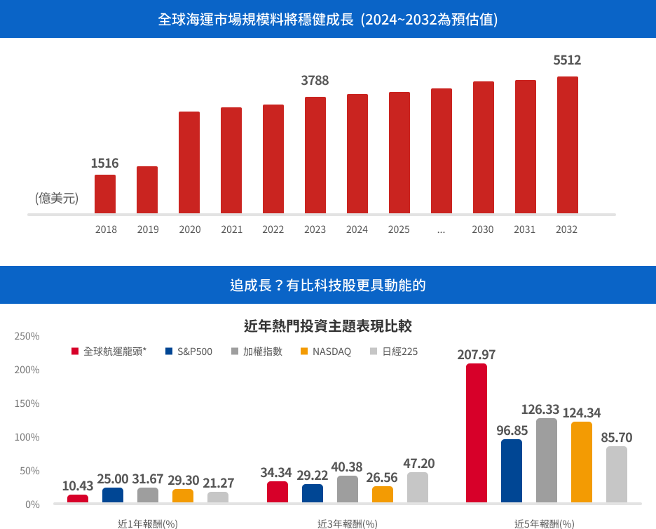 上圖資料來源:The Secondary Research, Primary Research, MRFR Database and Analyst Review,2024報告 (*2018為估算值)。投資人申購本基金係持有基金受益憑證,而非本文提及之投資資產或標的。下圖資料來源:ICE Data、Bloomberg,回測期間為2019/2/28-2024/12/31,計算方式,總報酬計算方式: (最後一天數值/第一天數值)-1。指數採NYSE FactSet 全球航運龍頭息收指數。*指NYSE FactSet 全球航運龍頭息收指數。S&P500(總報酬)指數、加權(總報酬)指數、NASDAQ(總報酬)指數、日經225(總報酬)指數。(NYSE FactSet 全球航運龍頭息收指數最早收盤日期:2019/2/8,指數發布日為2024/4/22)。以上僅為ETF追蹤指數績效或殖利率之表現,不代表本ETF基金之實際報酬率或配息率及未來績效保證,不同時間進場投資,其結果將可能不同,且並未考量交易成本。本基金主要係採用完全複製法追蹤標的指數之績效表現為目標,然因基金必要費用、為因應申贖及指數調整等之相關交易、為維持曝險比例而從事證券相關商品交易及視特殊情形需要採最佳化複製法等因素,仍可能使本基金偏離標的指數之表現。以上僅為標的指數成分股歷史資料回測結果,不代表本基金之未來績效保證。投資人無法直接投資指數,本資料僅為市場歷史數值統計概況說明,非基金績效表現之預測。