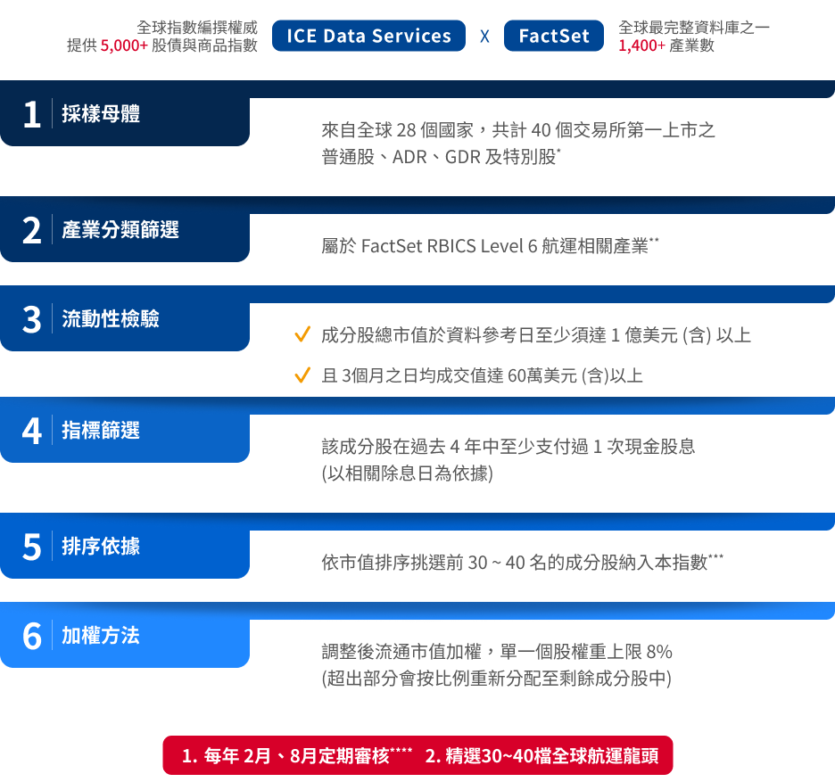 指數編製規則資料來源:ICE、FactSet、野村投信整理。*排除公開交易合夥事業(PTPs)、有限合夥(LPs)及業主有限合夥(MLPs)則不在本指數選股範疇。**FactSet RBISC Level 6航運相關之產業項目與數量將隨產業發展改變,此數量非固定。***若成分檔數不足30檔,則降低流動性標準即前述要求的3個月之日均成交值會降低至30萬美元,以選取額外證券補足成分檔數。成分股檔數最多40檔,最少30檔。****以2月、8月第二個星期五收盤後生效,審核資料(參考日)截至前一個月最後一個交易日。若替換率大於50%,新成分股中市值最小者由被剔除之原成分股市值最大者取代,直至替換率符合標準。詳細指數成分股篩選流程請詳閱NYSE FactSet 全球航運龍頭息收指數編製規則。