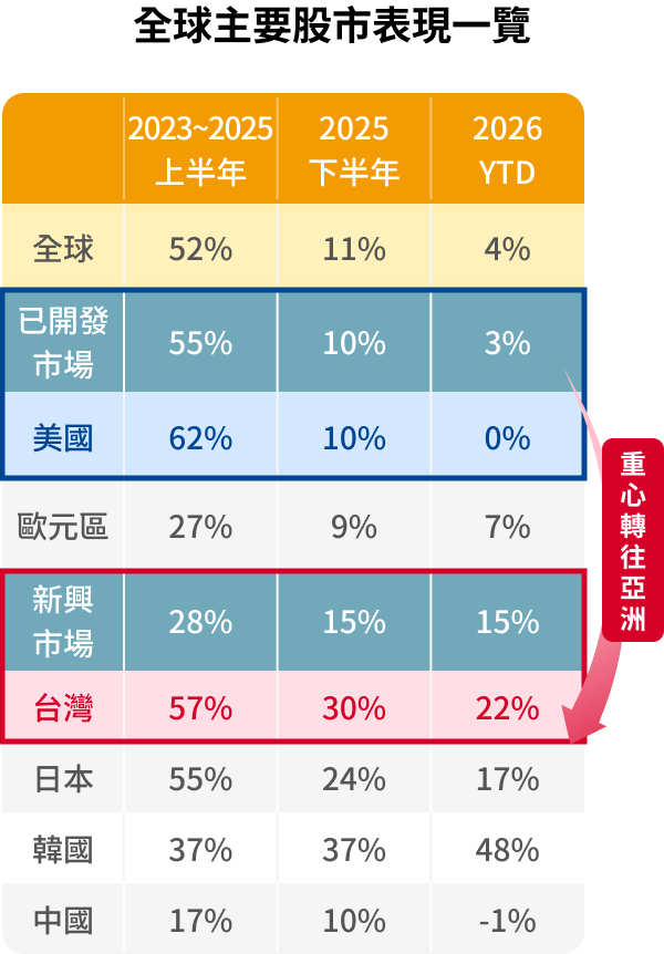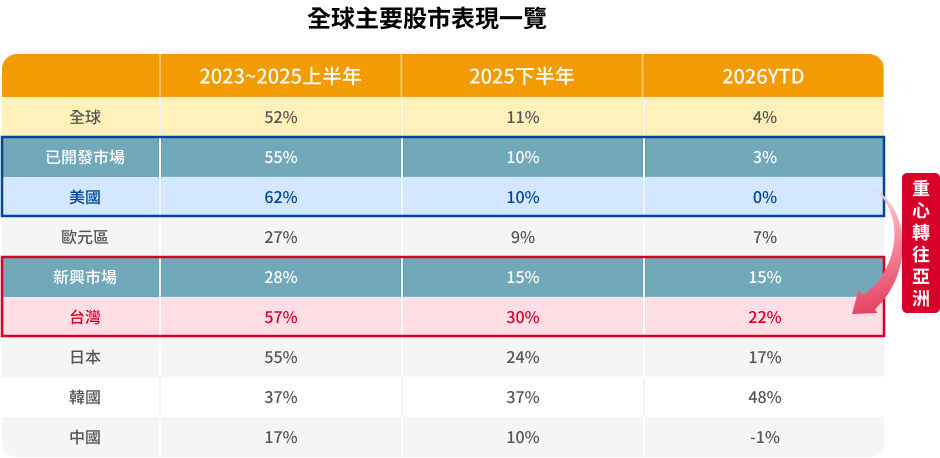 資料來源:Bloomberg,資料截至2026/2/28。註:上述美國、歐元區、台灣、日本、韓國股市採用採用當地代表性指數,其餘市場均採用MSCI系列指數。本文提及之經濟走勢預測不必然代表基金之績效,基金投資風險請詳閱基金公開說明書。投資人無法直接投資指數,本資料僅為市場歷史數值統計概況說明,非基金績效表現之預測 。