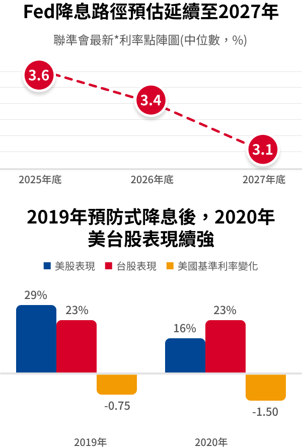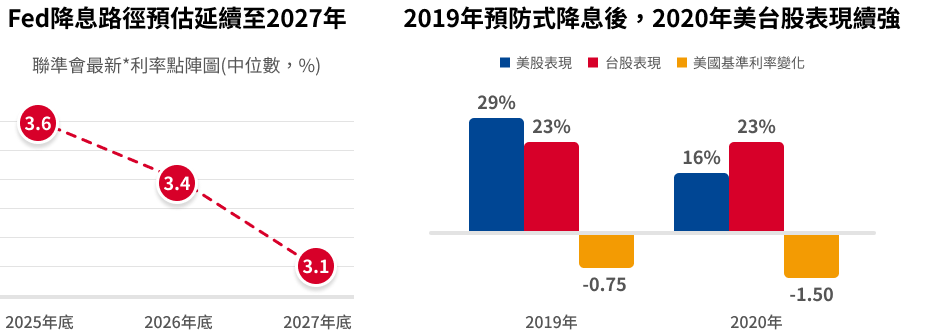 資料來源:(左) FOMC會議,2026/3;(右) Bloomberg、野村投信整理,2026/3。註:上述美股採用標普500指數、台股採用台灣加權指數。本文提及之經濟走勢預測不必然代表基金之績效,基金投資風險請詳閱基金公開說明書。投資人無法直接投資指數,本資料僅為市場歷史數值統計概況說明,非基金績效表現之預測。