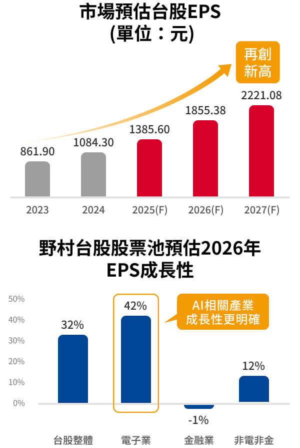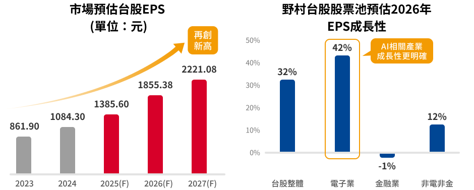 資料來源:(左) Bloomberg,2026/3/11之預估資料;(右) 野村投信整理,2026/3。本文提及之經濟走勢預測不必然代表基金之績效,基金投資風險請詳閱基金公開說明書。投資人無法直接投資指數,本資料僅為市場歷史數值統計概況說明,非基金績效表現之預測。