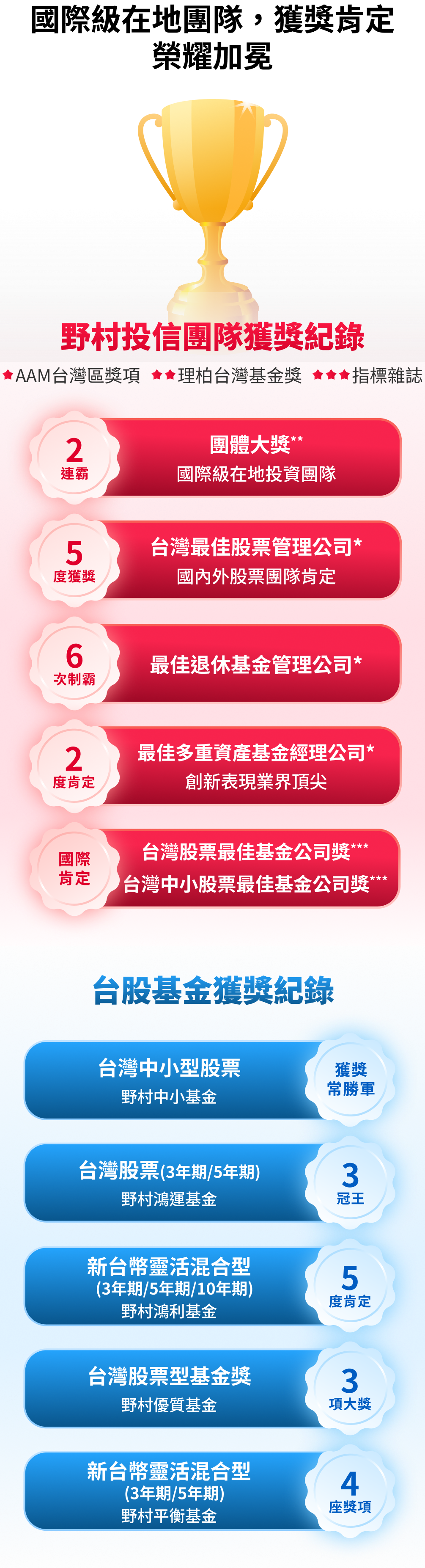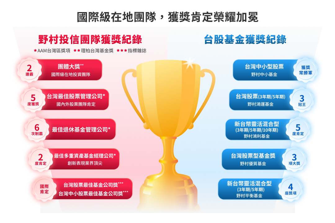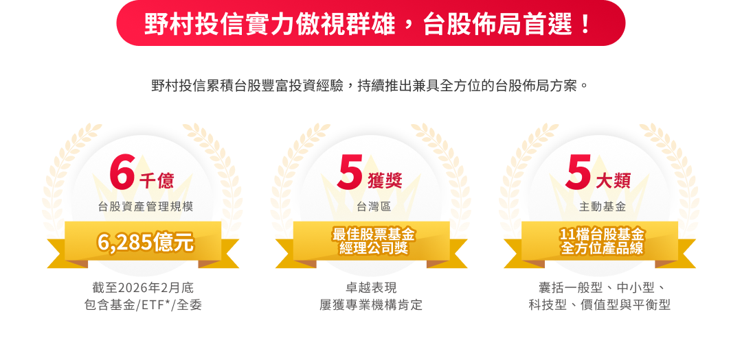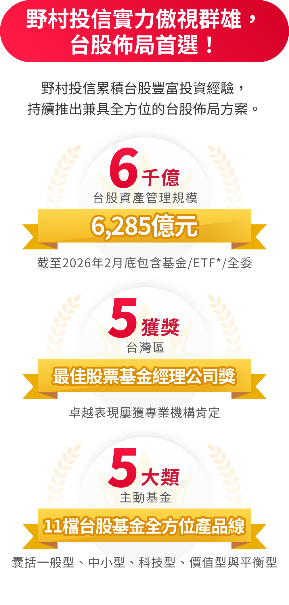(上)規模資料來源:投信投顧公會;獎項資料來源:亞洲資產管理雜誌;資料日期:2026/03。註:5獲獎得獎年度:2020~2023&2026年。*不含投資型保單(台幣/外幣類全委帳戶)之委託。(下)團隊獲獎資料來源:*AAM(亞洲資產管理雜誌)、**理柏、***Benchmark(指標雜誌),截至2026年。 2連霸團體大獎:2021~2022年;5度獲獎最佳股票管理公司:2020~2023&2026年;6次制霸最佳退休基金管理公司:2018~2020年&2024~2026年;2度肯定最佳多重資產基金經理公司:2023&2025年;指標雜誌台灣股票最佳基金公司獎&台灣中小股票最佳基金公司獎:2021年。 台股基金獲獎資料來源:晨星暨Smart智富基金評鑑、理柏、台北金融研究發展基金會、野村投信整理,截至2026年。 獲獎常勝軍:台灣中小型股票基金獎:2013~2026年均有獲獎;三冠王台灣股票基金獎: 2024~2025年;5度肯定新台幣靈活混合型(3年期/5年期/10年期):2021~2024 &2026年;3項大獎台灣股票型基金獎:2022年;4座獎項新台幣靈活混合型(3年期/5年期):2010、2021、2024、2026年。詳請參考野村投信投資理財網(得獎紀錄)。https://www.nomurafunds.com.tw/Web/Content/#/primary/about/reward