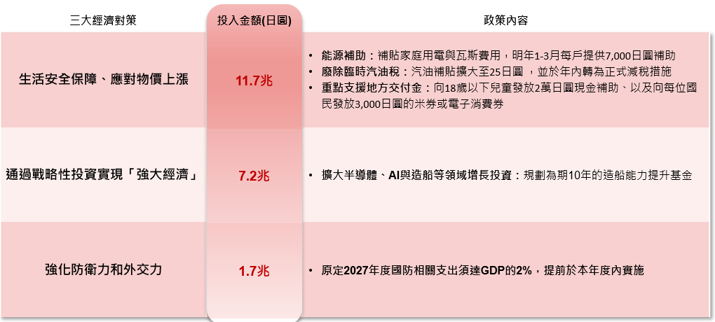 資料來源:NAM Tokyo,野村投信整理,2025/11/21。註:三大經濟對策支柱的投入金額加總為20.6兆日圓,剩餘的7,000億日圓將預留為備用資金,用於因應天然災害及熊害事件所造成的損失。本文提及之經濟走勢預測不必然代表基金之績效,基金投資風險請詳閱基金公開說明書。