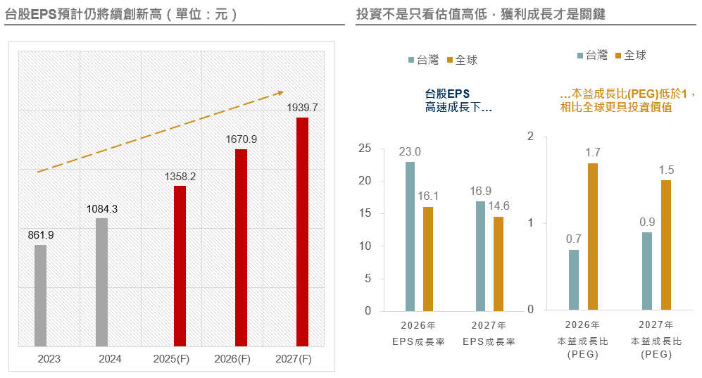 AI發展離不開台灣半導體供應鏈,隨先進製程與封裝需求擴大,台股EPS成長性優於全球。