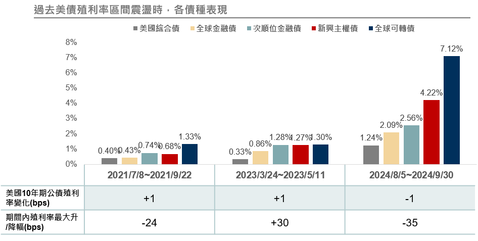 資料來源與日期:Bloomberg,2024/9/30。以上採摩根大通新興主權美元債指數、彭博美國綜合債/全球金融債/次順位金融債/全球可轉債指數。投資人無法直接投資指數,本資料僅為市場歷史數值統計概況說明,非基金績效表現之預測。本文提及之經濟走勢預測不必然代表基金之績效,基金投資風險請詳閱基金公開說明書。