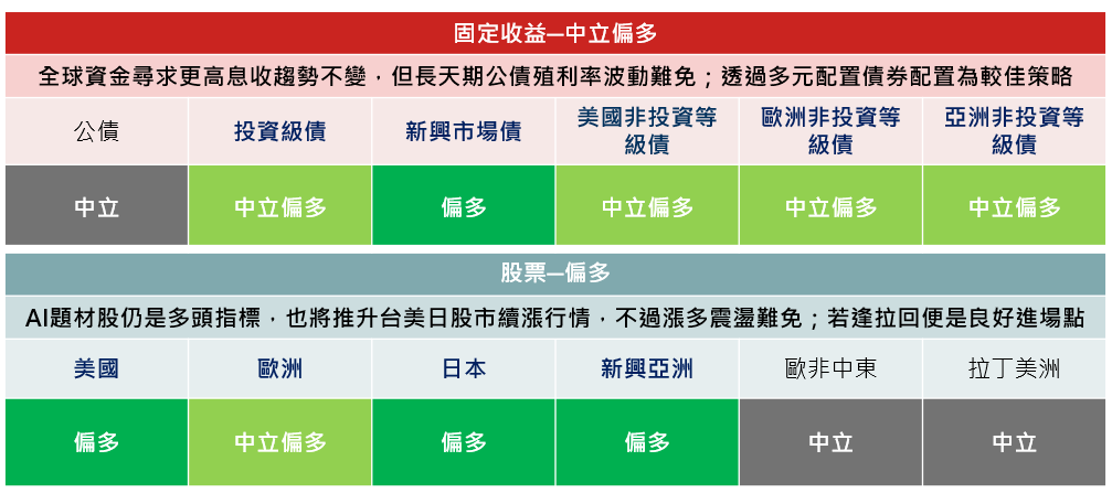 2026年Q1投資環境呈現「股市中場休息、債市講求配置效率」的格局。股市方面,基本面與獲利成長仍是支撐行情的核心,短線震盪反而提供布局良機;債市方面,殖利率雖已回落,但長端壓力未除,多元債種與中天期配置的重要性明顯提升。投資策略上,建議以「分散配置、順勢而為」因應仍具變化的金融市場。